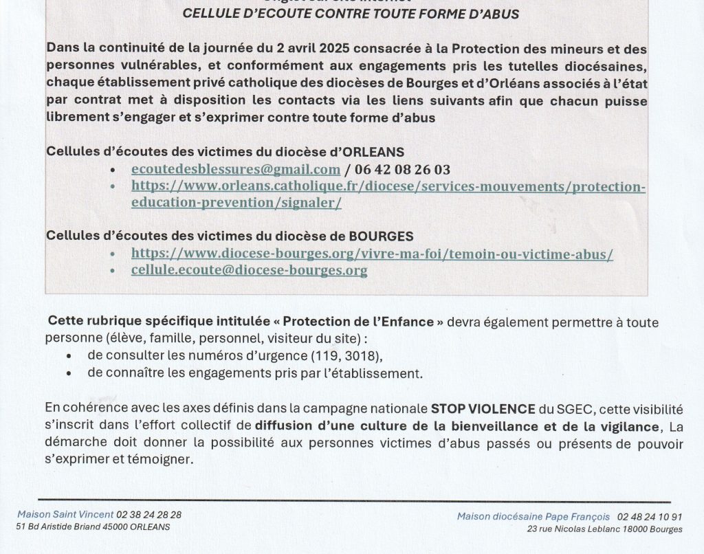 Pour contacter la direction, prendre rendez-vous au secrétariat : 02 38 36 22 91 ou 07 81 93 47 56